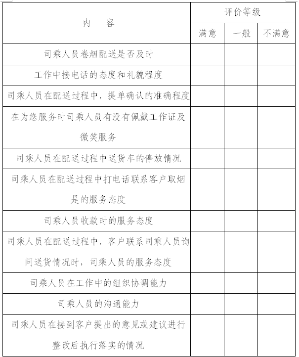 2、考核評比規(guī)定:客戶如對司乘人員服務(wù)質(zhì)量不滿意(含一般)的,本公司將會在月、季和年度考核評比中時給予相應(yīng)的獎懲。